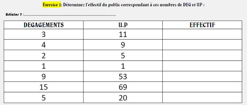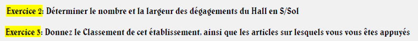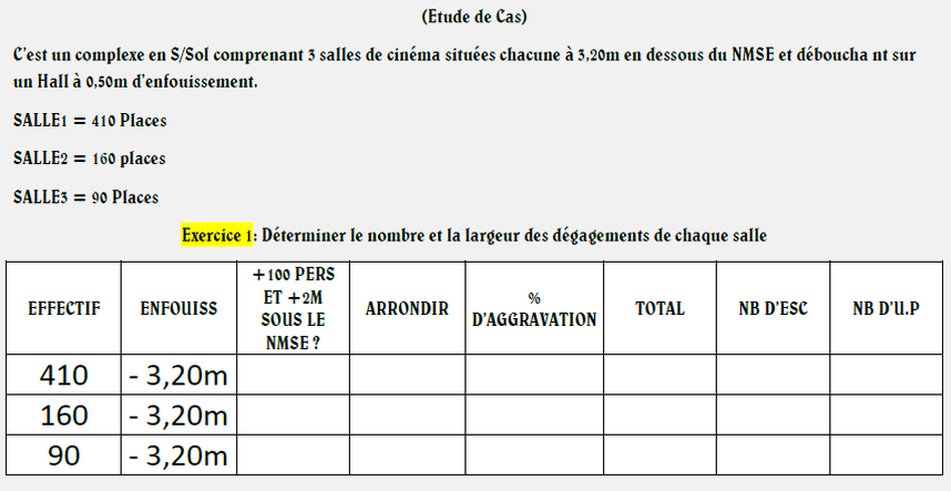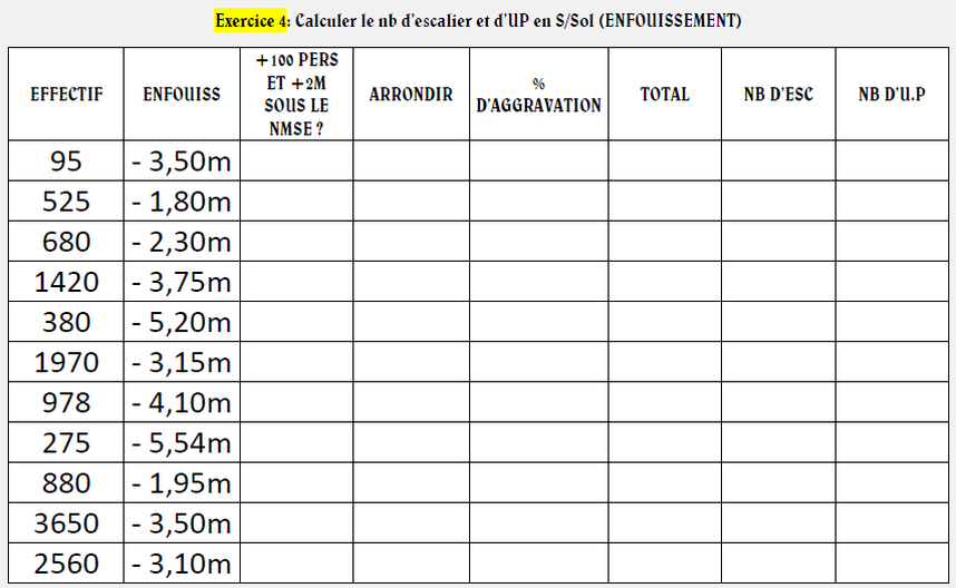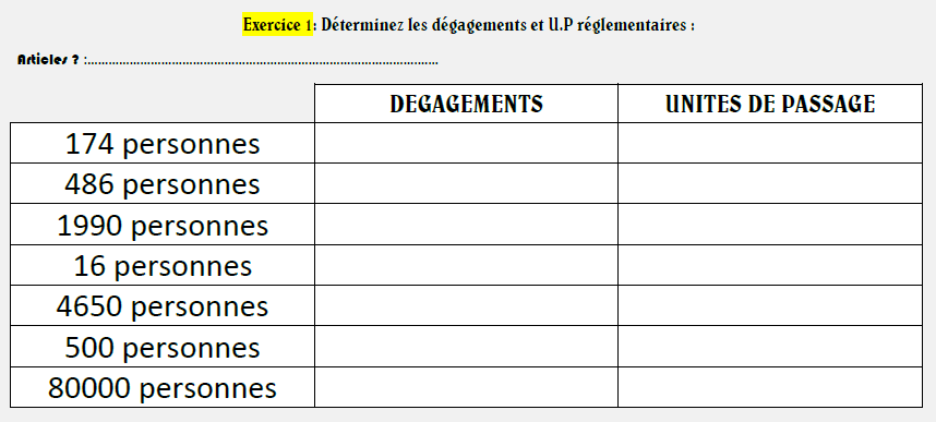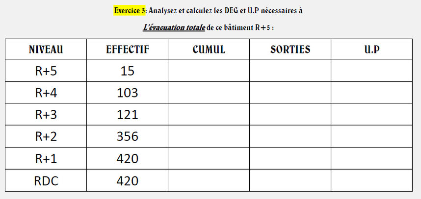EXERCICE DE CALCUL DE DEGAGEMENTS N°1 METTEZ LE CURSEUR ICI POUR LA REPONSERéponse exercice 1 : 174p : 2D 3UP 486p : 2D 6UP 1990p : 5D 20UP 16p: 1D 1UP 4650p: 11D 47UP 500p: 2D 6UP 80000p: 161D 800UP EXERCICE DE CALCUL DE DEGAGEMENTS N°2 METTEZ LE CURSEUR ICI POUR LA REPONSERéponse exercice 2 : 3D 11UP : impossible 4D 9UP : impossible 2D 5UP : 400p 1D 1UP : 1p à 19p 9D 53UP : impossible 15D 69UP : impossible 5D 20UP : 1901p EXERCICE DE CALCUL DE DEGAGEMENTS N°3 METTEZ LE CURSEUR ICI POUR LA REPONSERéponse exercice 3 : R+5 :1D UP R+4 : 118p soit 2D 3UP R+3 : 239p soit 2D 4UP R+2 : 595p soit 3D 6UP R+1 : 1015p soit 4D 11UP Rdc : 1435p soit 4D 15UP EXERCICE DE CALCUL DE DEGAGEMENTS N°4 METTEZ LE CURSEUR ICI POUR LA REPONSERéponse exercice 4 : 95p pas d'aggravation car -100 personnes donc calcul classique 525p pas d'aggravation car enfouissement inférieur à 2m donc calcul classique -> 3D 6UP 680p arrondit à 700 + 10% soit 770p -> 3D 8UP 1420p arrondit à 1500 + 20% soit 1800p -> 5D 18UP 380p arrondit à 400 + 40% soit 560p -> 3D 6UP 1970p arrondit à 2000 + 20% soit 2400p -> 6D 24UP 978p arrondit à 1000 + 30% soit 1300p -> 4D 13UP 275p arrondit à 300 + 40% soit 420p -> 2D 6UP 880p pas d'aggravation car enfouissement inférieur à 2m donc calcul classique -> 3D 9UP 3650p arrondit à 4000 + 20% soit 4800p -> 11D 48UP 2560p arrondit à 2600 + 20% soit 3120p -> 8D 32UP EXERCICE DE CALCUL DE DEGAGEMENTS N°5